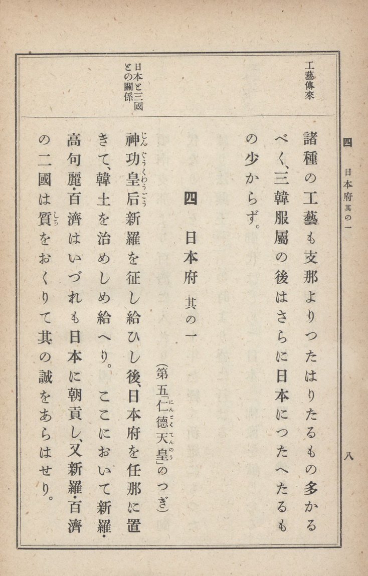 임나의 여러 나라를 보호하기 위해 신라를 정벌하고 임나에 일본부를 설치하였다. 신라, 고구려, 백제는 모두 일본에 조공을 바쳤으며 신라와 백제는 또 일본에 볼모를 두어 그 진심을 나타냈다.