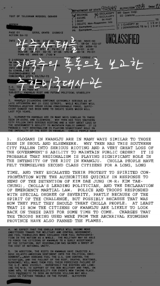 1980.05.21 광주사태를 지역주의 폭동으로 보고한 주한미국대사관