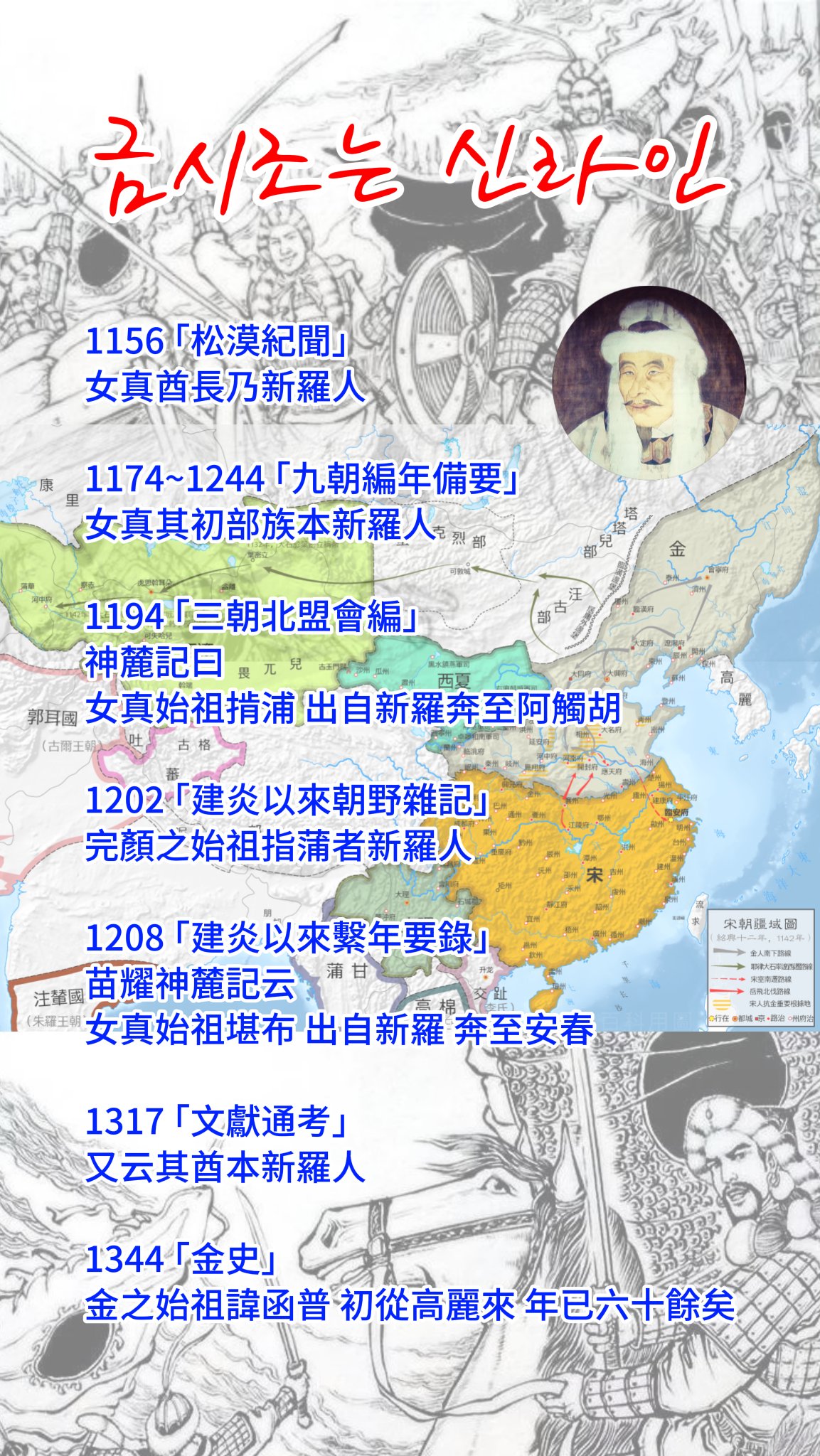 금나라 시조에 대한 기록은 금나라에서 들은 이야기를 기록한 송막기문에 신라인으로 처음 나타납니다. 그 이야기는 금나라 황실로부터 직접 들은 이야기인 듯합니다. 신라가 고려로 바뀐 지 200여년 후인데도 구지 신라인이라 한 걸 보면 신라인이 맞겠죠. 이후 원나라가 금사를 편찬하여 금시조가 고려인이라고 할 때까지 200여년간 모든 사서에 신라인으로 표기됩니다. 고려인이란 표기는 금사 이후 비로소 나타나죠. 그렇다면 금시조는 신라인이었다고 보는 것이 맞습니다 ...