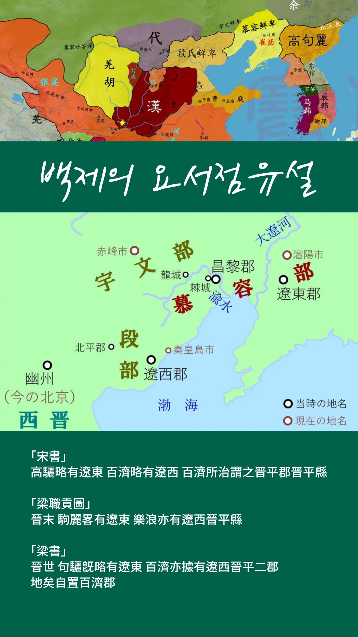488년에 편찬된 宋書에는 '高驪가 遼東을 차지하자 百濟는 遼西를 차지하였다. 百濟는 치소를 두고 晋平郡 晋平縣이라 했다'고 되어 있으나, 이는 다른 역사 기록들과 전혀 어울리지 않죠.