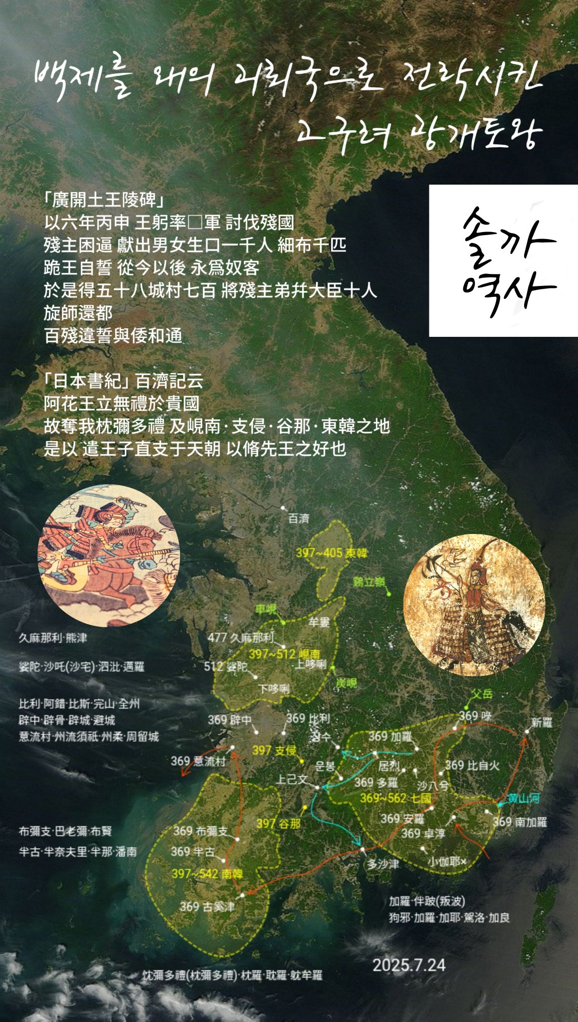 백제는 肖古王 때, 왜와 함께 반도 남부를 정벌하고 각각 영산강 유역과 낙동강 유역을 나누어 차지할 때만 해도 왜와 대등한 관계였습니다.