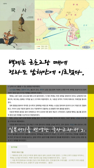 국사교과서는 백제가 근초고왕 때에 전라도 남해안에 이르렀다고 하였습니다. 여기서 근초고왕은 사실 초고왕인데, 초고왕 때 백제가 전라도 남해안에 이르렀다는 이야기는 일본서기에만 나오는 이야기입니다. 백제가 369년에 왜와 연합하여 반도 남부를 정벌하고 각각 영산강 유역과 낙동강 유역을 나눠 가졌다는 이야기입니다. 국사교과서는 이 이야기에서 왜에 대한 부분만 쏙 빼고 적어놓았습니다.