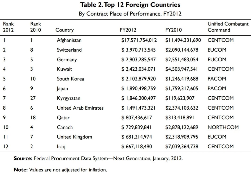 미군예산이 집행된 지역별로 예산을 나눌 수 있는데 2010년 해외에서 집행된 미군예산은 아래와 같다. 이 비용은 현지인에게 지급된 인건비, 시설비 등 해당 지역에서 쓴 돈이기 때문에 독일, 일본, 한국 등은 그 비용의 일부를 부담하고 있다. 한국에서는 이때 1조 4천여억 원의 비용중 8천여억 원을 부담하였다.