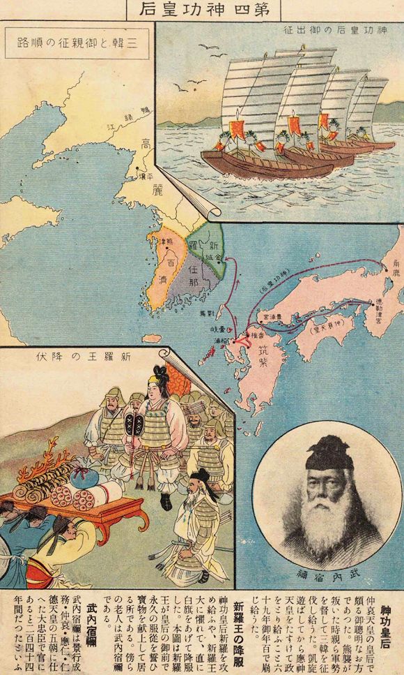 足仲彦천황이 죽자 황후는 남자의 복장을 하고 신라를 정벌하였다. 신라왕 宇流助富利智干을 사로잡아 해변에 데리고 가 무릎뼈를 빼고 돌 위에서 기게 하였다. 조금 있다가 목을 베어 모래 속에 묻었다. 그리고 한 사람을 머물게 하여 신라의 재상으로 삼고 돌아왔는데 신라왕의 처가 재상을 유인하여 죽였다. 왜가 다시 쳐들어가자 신라인들이 신라왕의 처를 죽여 사죄하였다.