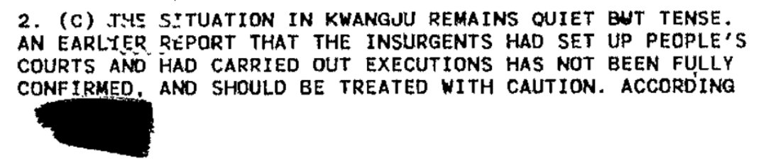 주한 미대사관에서 미국무부에 보낸 5월 26일자 한국 상황 보고 - 자치조직들이 만들어졌고, 강경 세력이 이전에 반납했던 무기를 되찾아 다시 무장했으며, 심지어 인민재판과 처형까지 이루어지고 있다는 보고가 있다.