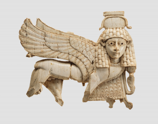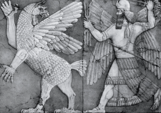 Gypsum wall panel relief: showing the monster Anzu facing left. The panel is part of a group as follows: gypsum wall panel reliefs showing god and monster. The god is Ninurta, chief god of the city of Nimrud and has a thunderbolt in each hand; he pursues