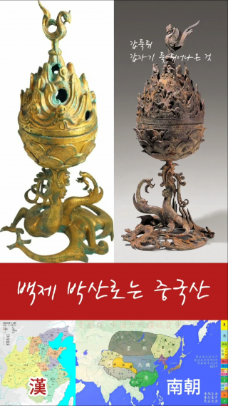 왼쪽은 漢나라의 金銅盤龍朱雀博山爐고 오른쪽은 百濟 출토 博山爐인데, 구조와 모양이 놀랍도록 비슷하여 전승된 것이 분명합니다.