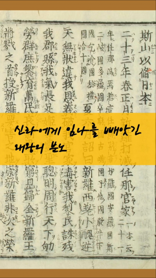 新羅 長戟强弩 凌蹙任那 鉅牙鉤爪 殘虐含靈 刳肝斮趾 不厭其快 曝骨焚屍 不謂其酷 任那族姓 百姓以還 窮刀極俎 旣屠且膾 신라는 긴 창과 강한 활로 임나를 능욕했고 커다란 이빨과 갈고리 같은 손톱으로 중생들을 잔혹하게 죽였다. 간을 꺼내고 발목을 자르고도 만족하지 않았고 뼈가 드러나게 하고 주검을 불태우고도 잔혹하게 여기지 않았다. 임나의 귀족과 백성들은 칼과 도마가 닳도록 도륙당하고 회쳐졌다.